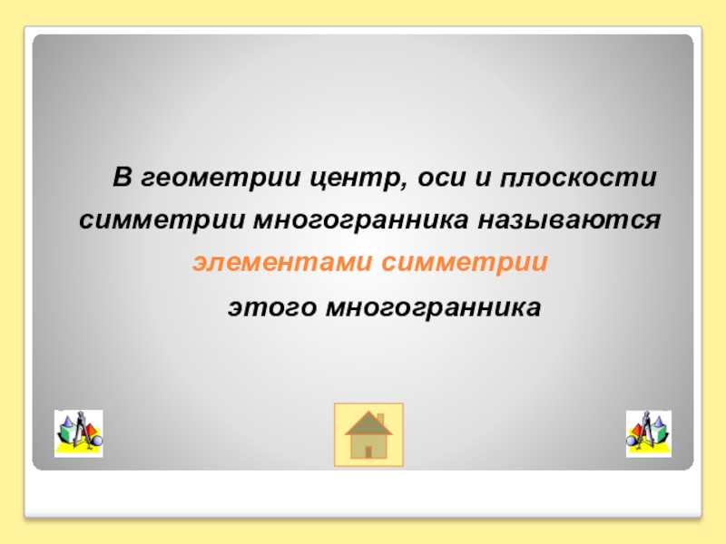 Слайд 9В геометрии центр, оси и плоскости симметрии многогранника называются элементами симметрии