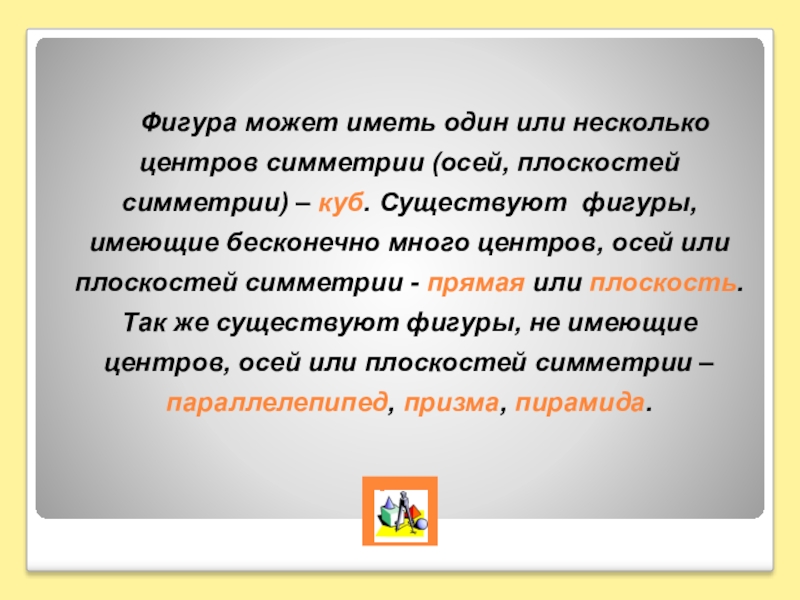 – куб. Существуют фигуры, имеющие бесконечно много центров, осей или плоскостей симметрии - прямая или плоскость. Так же существуют фигуры, не имеющие центров, осей или плоскостей симметрии – параллелепипед, призма, пирамида.