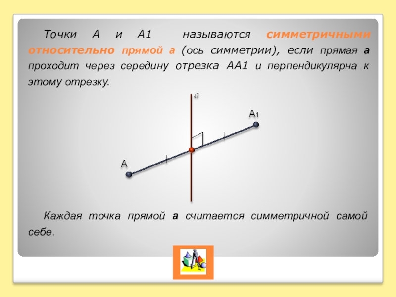 Точки А и А1 называются симметричными относительно прямой а (ось симметрии), если прямая а проходит через середину