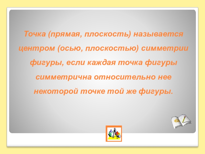 Слайд 5Точка (прямая, плоскость) называется центром (осью, плоскостью) симметрии фигуры, если каждая