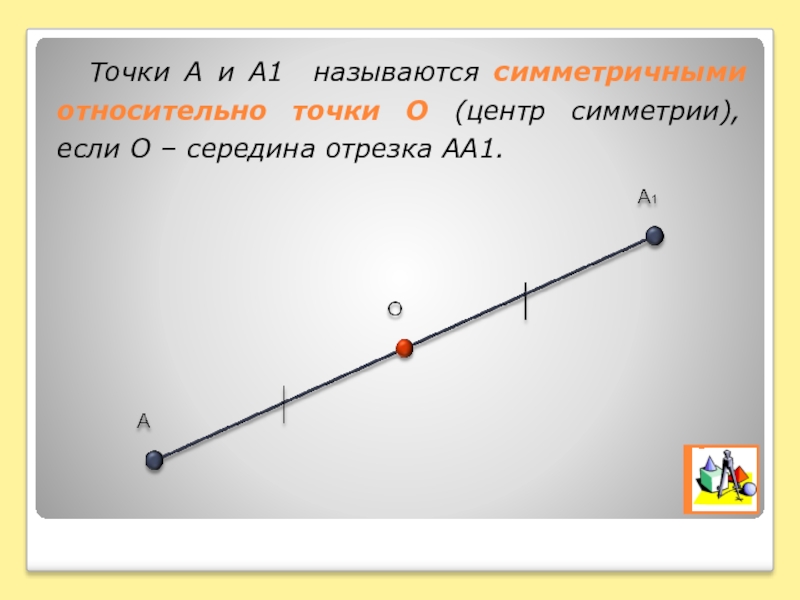 Слайд 2Точки А и А1 называются симметричными относительно точки О (центр симметрии),