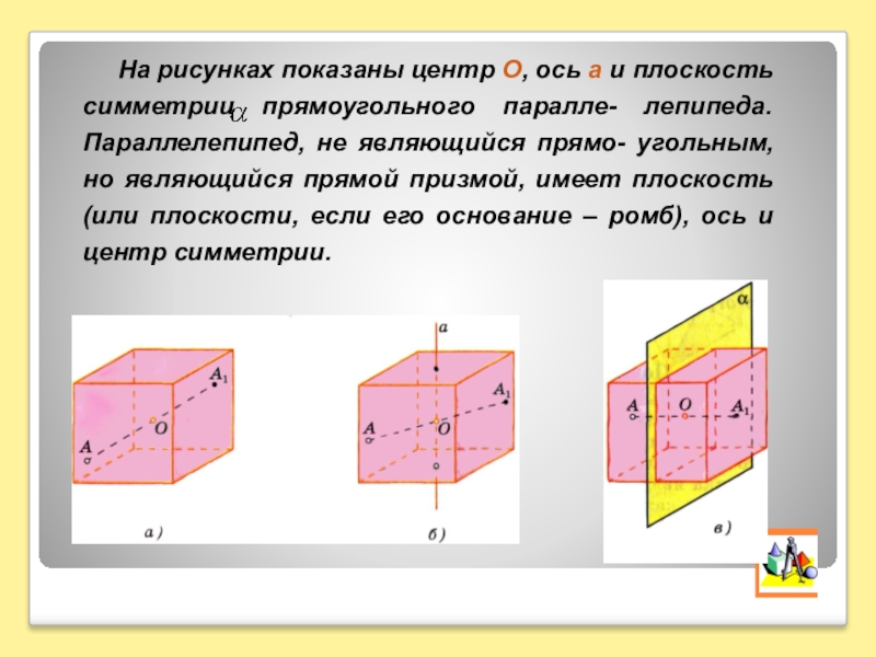На рисунках показаны центр О, ось а и плоскость симметрии прямоугольного паралле- лепипеда. Параллелепипед, не являющийся прямо-