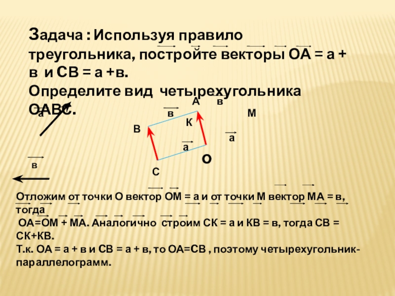 Т.к. ОА = а + в и CВ = а + в, то ОА=CВ , поэтому четырехугольник- параллелограмм.