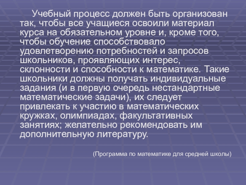 все учащиеся освоили материал курса на обязательном уровне и, кроме того, чтобы обучение способствовало удовлетворению потребностей и запросов школьников, проявляющих интерес, склонности и способности к математике. Такие школьники должны получать индивидуальные задания (и в первую очередь нестандартные математические задачи), их следует привлекать к участию в математических кружках, олимпиадах, факультативных занятиях; желательно рекомендовать им дополнительную литературу.