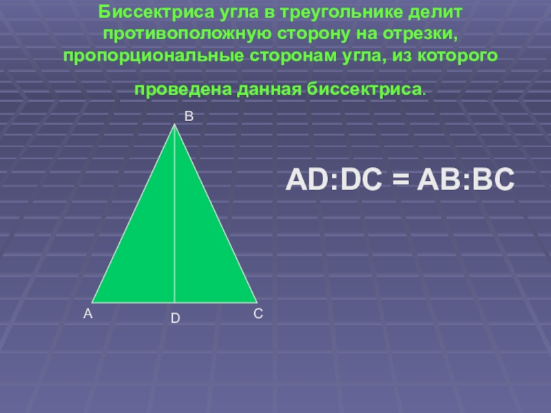 Слайд 2Биссектриса угла в треугольнике делит противоположную сторону на отрезки, пропорциональные сторонам