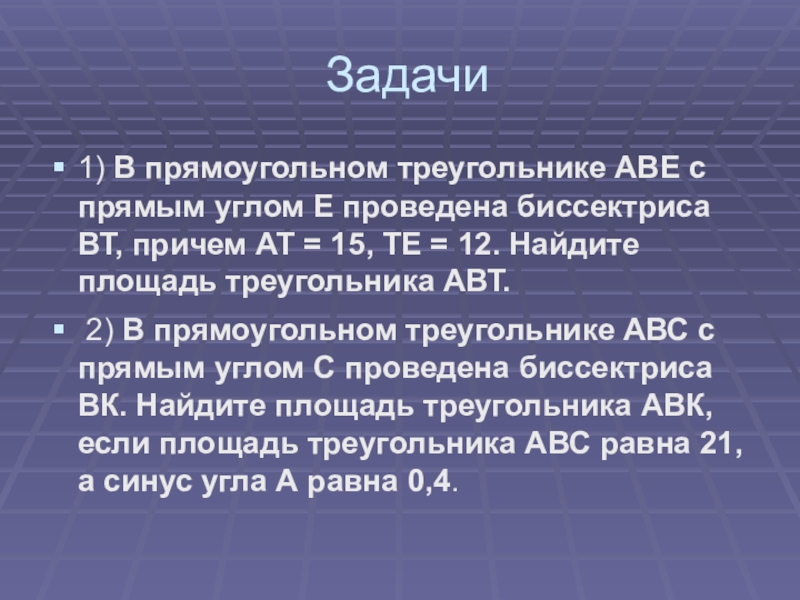 1) В прямоугольном треугольнике АВЕ с прямым углом Е проведена биссектриса