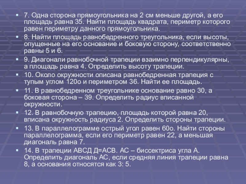 7. Одна сторона прямоугольника на 2 см меньше другой, а его
