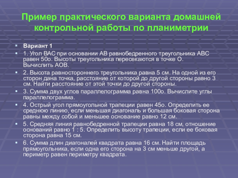 Слайд 13Пример практического варианта домашней контрольной работы по планиметрии