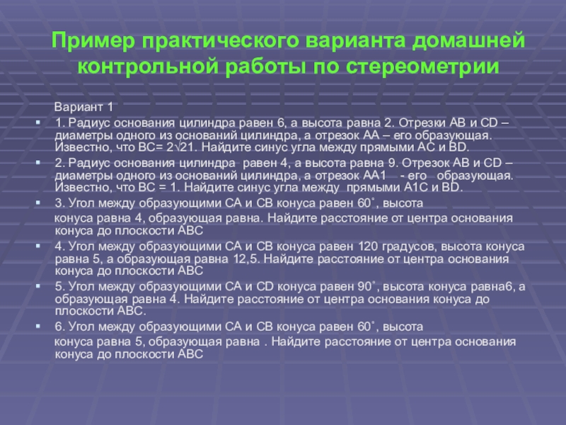 Слайд 15Пример практического варианта домашней контрольной работы по стереометрии