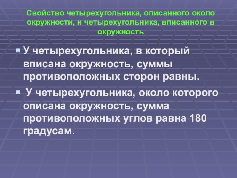 Слайд 4Свойство четырехугольника, описанного около окружности, и четырехугольника, вписанного в окружность