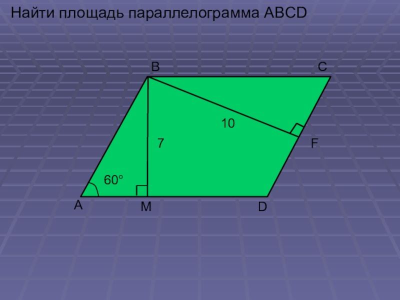 13. В параллелограмме острый угол равен 60o. Найти стороны параллелограмма, если его периметр равен 22, а меньшая диагональ равна 7.