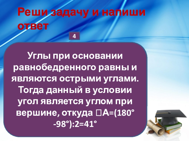 Углы при основании равнобедренного равны и являются острыми углами. Тогда данный в условии угол является углом при вершине, откуда ꓡА=(180° -98°):2=41°