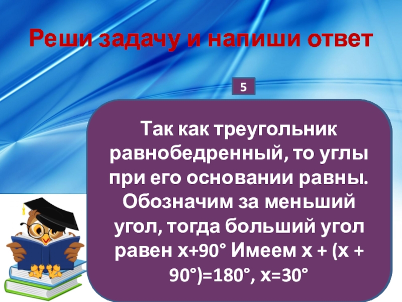 Так как треугольник равнобедренный, то углы при его основании равны. Обозначим за меньший угол, тогда больший угол равен х+90° Имеем х + (х + 90°)=180°, х=30°