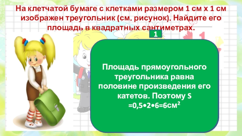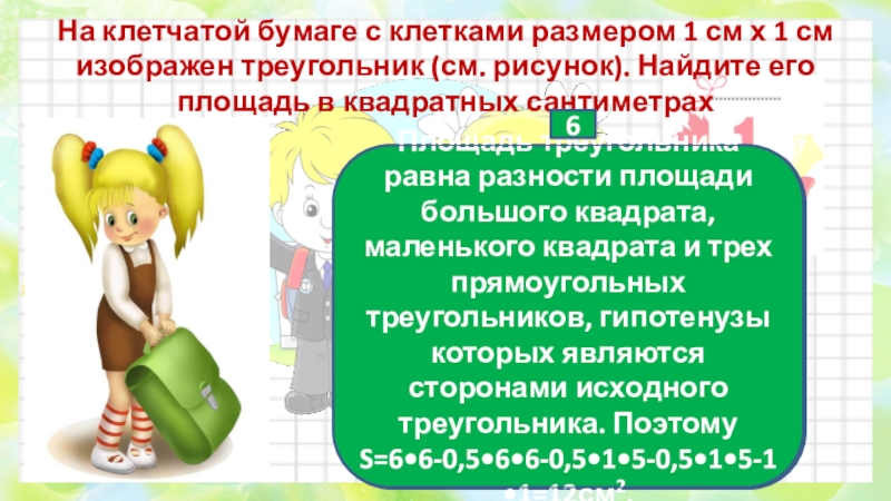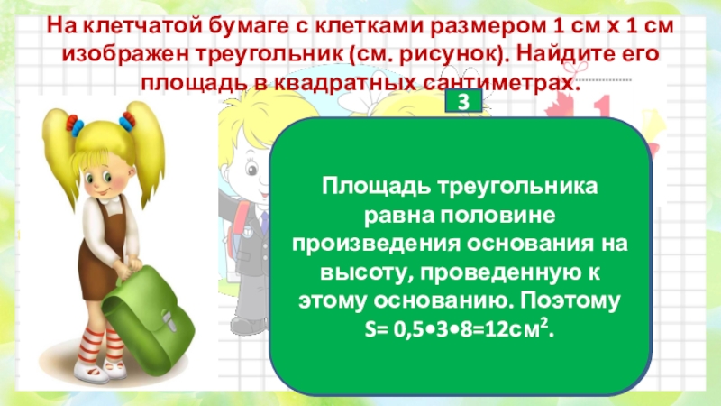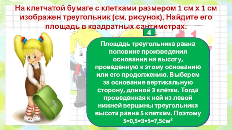 Площадь треугольника равна половине произведения основания на высоту, проведенную к этому основанию или его продолжению. Выберем за основание вертикальную сторону, длиной 3 клетки. Тогда проведенная к ней из левой нижней вершины треугольника высота равна 5 клеткам. Поэтому S=0,5•3•5=7,5см2