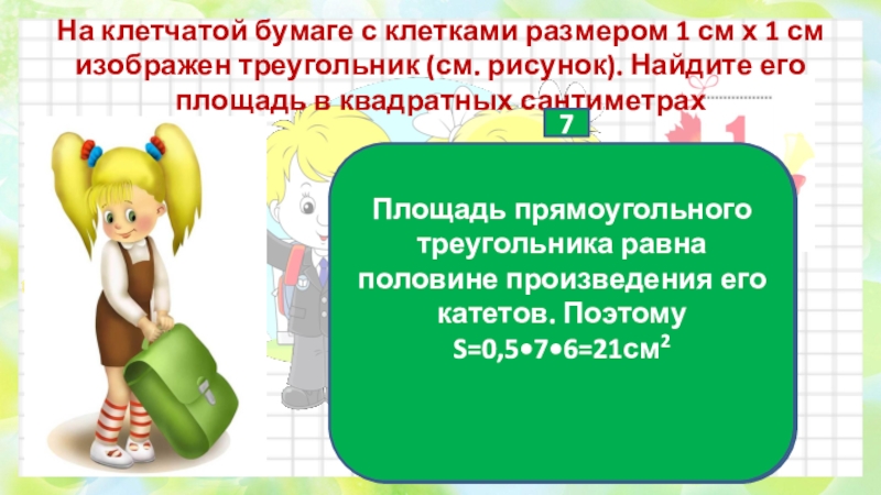 Площадь прямоугольного треугольника равна половине произведения его катетов. Поэтому S=0,5•7•6=21см2