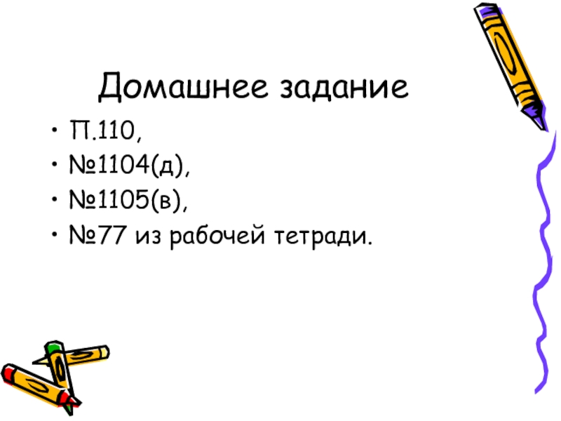 Домашнее заданиеП.110,№1104(д),№1105(в),№77 из рабочей тетради.