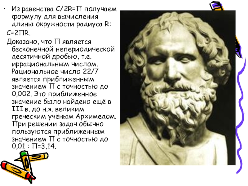 Доказано, что П является бесконечной непериодической десятичной дробью, т.е. иррациональным числом. Рациональное число 22/7 является приближенным значением П с точностью до 0,002. Это приближенное значение было найдено ещё в III в. до н.э. великим греческим учёным Архимедом. При решении задач обычно пользуются приближенным значением П с точностью до 0,01 : П=3,14.