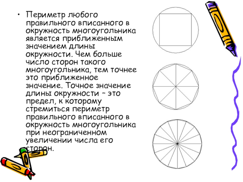 Периметр любого правильного вписанного в окружность многоугольника является приближенным значением длины окружности. Чем больше число сторон такого