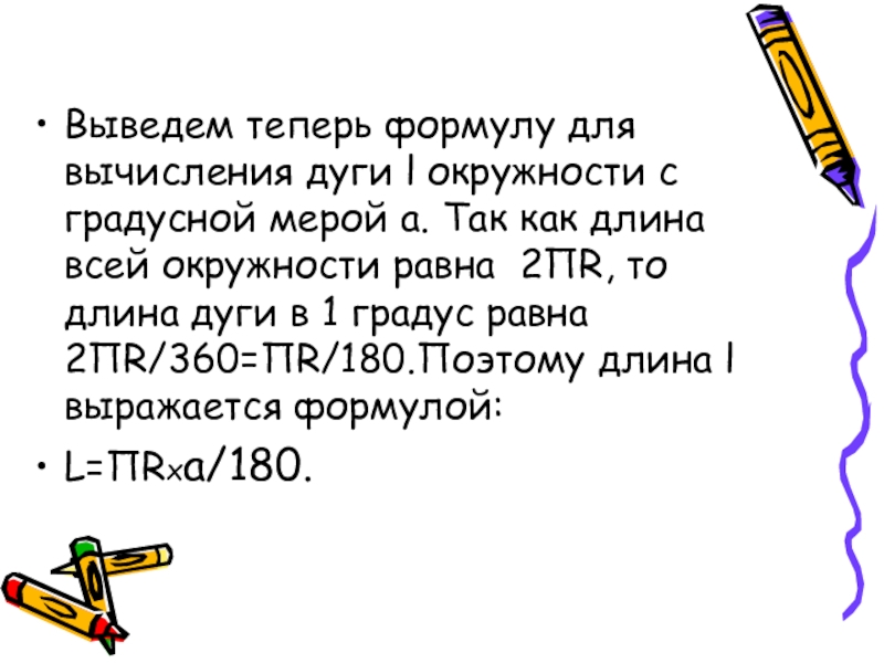 Слайд 8Выведем теперь формулу для вычисления дуги l окружности с градусной мерой