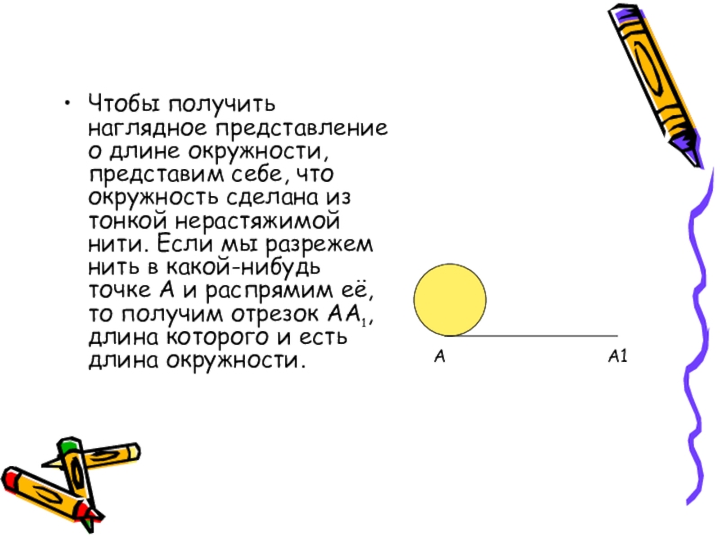 сделана из тонкой нерастяжимой нити. Если мы разрежем нить в какой-нибудь точке А и распрямим её, то получим отрезок АА1, длина которого и есть длина окружности.