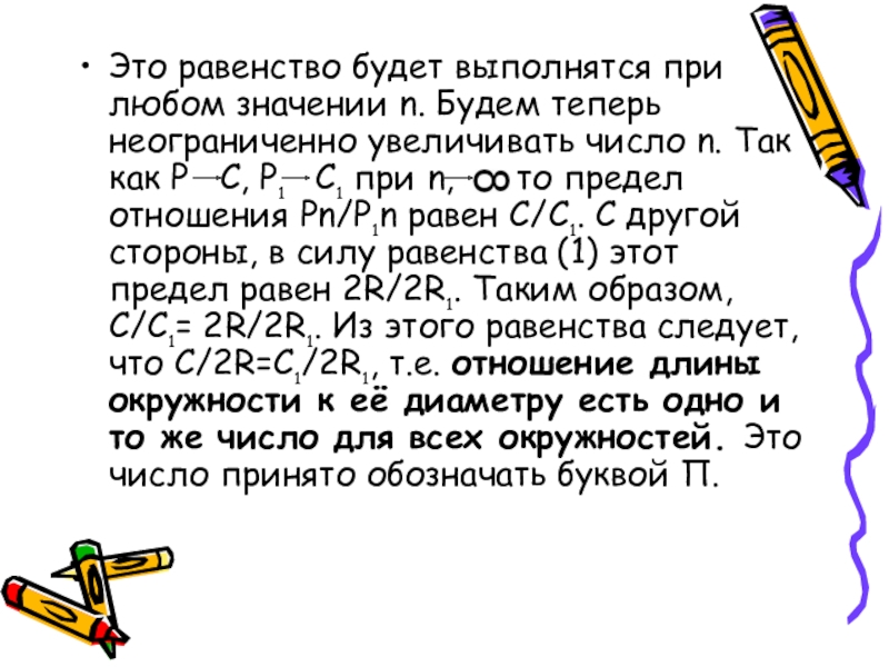 С1 – длины окружностей радиусов R и R1. Впишем в каждую из них правильный n-угольник и обозначим через Pn и Pn1 их периметры. Используя формулу, получаем: