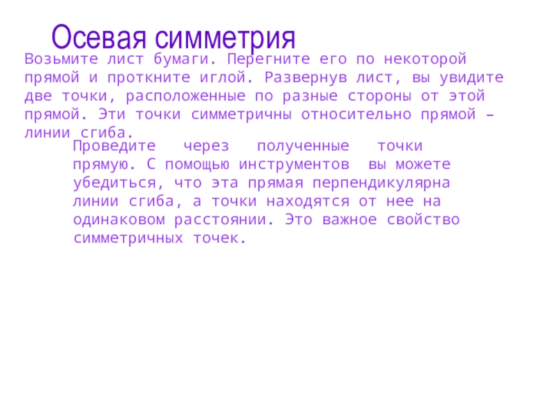 Проведите через полученные точки прямую. С помощью инструментов вы можете убедиться, что эта прямая перпендикулярна линии сгиба, а точки находятся от нее на одинаковом расстоянии. Это важное свойство симметричных точек.