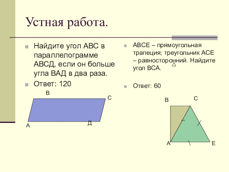 АВСЕ – прямоугольная трапеция; треугольник АСЕ – равносторонний. Найдите угол ВСА.