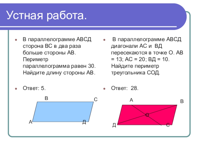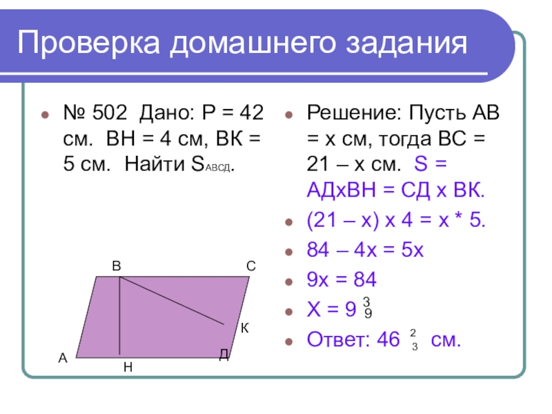 Решение: Пусть АВ = х см, тогда ВС = 21 – х см. S = АДхВН = СД х ВК.