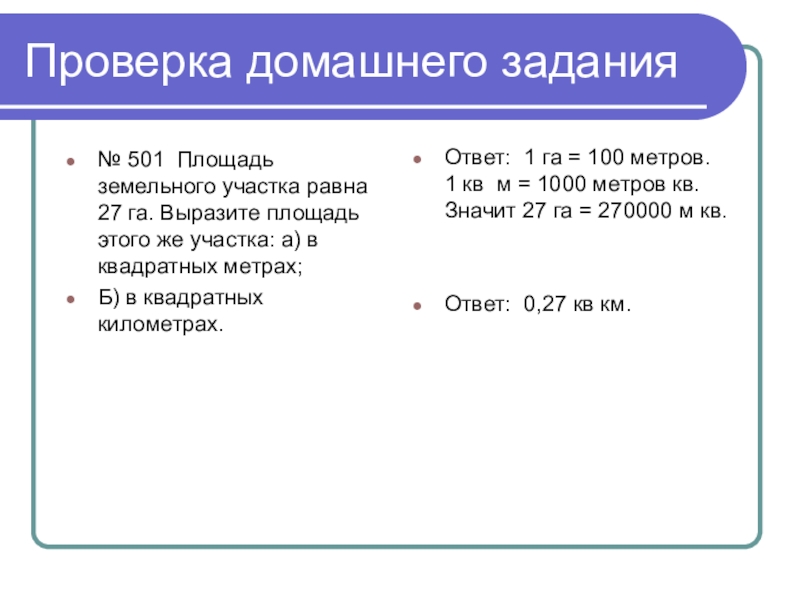 Ответ: 1 га = 100 метров. 1 кв м = 1000 метров кв. Значит 27 га = 270000 м кв.