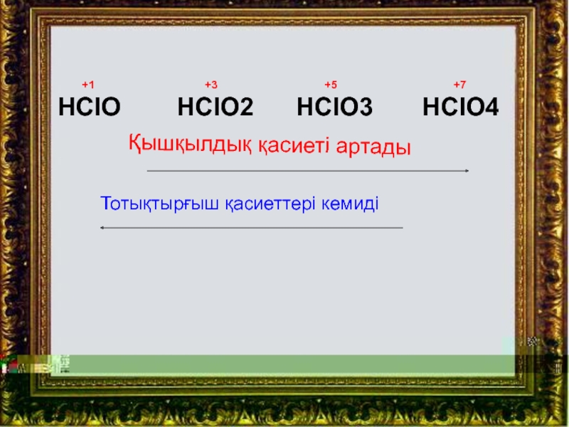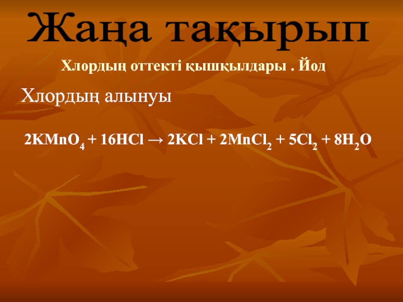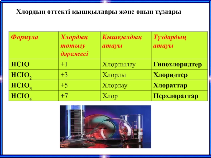 6KOH + 3С12 = KCIO3 +5KCI + 3 H2 O (ыстық сілті) 2KOH + С12 = KCIO +KCI + H2 O (суық сілті)