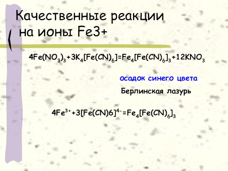 Качественные реакции  на ионы Fe3+4Fe(NO3)3+3K4[Fe(CN)6]=Fe4[Fe(CN)6]3+12KNO3