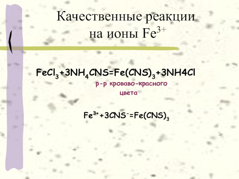 Качественные реакции  на ионы Fe3+FeCl3+3NH4CNS=Fe(CNS)3+3NH4Cl