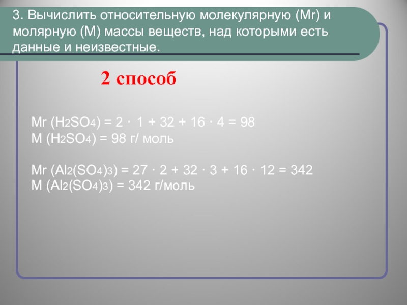 Мr (H2SO4) = 2 · 1 + 32 + 16 · 4 = 98