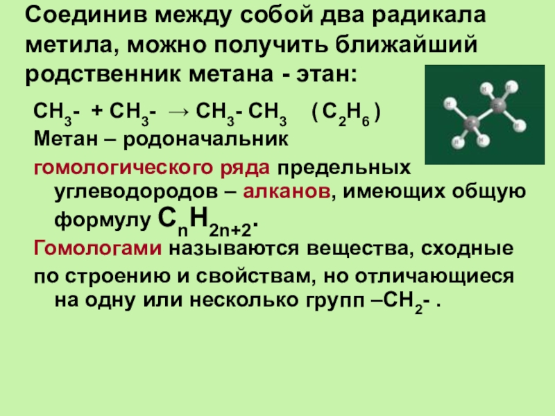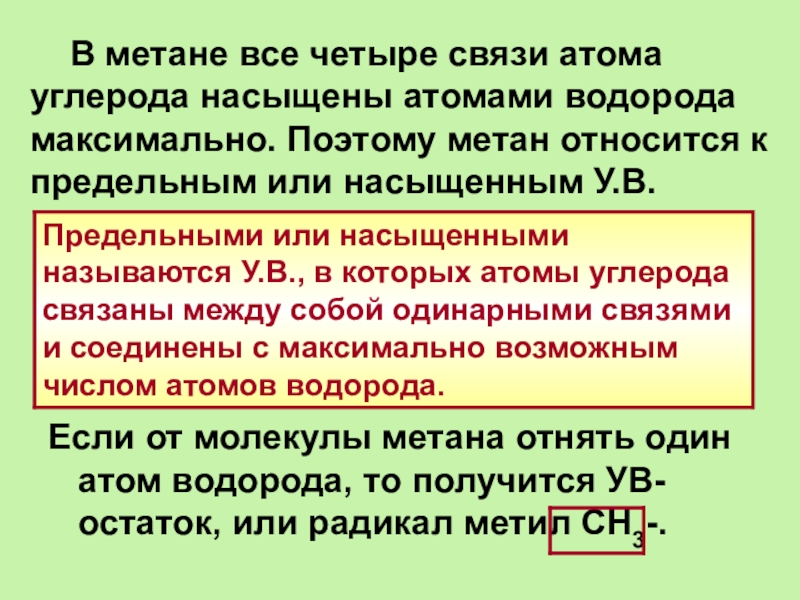 Если от молекулы метана отнять один атом водорода, то получится УВ-остаток, или радикал метил СН3-.