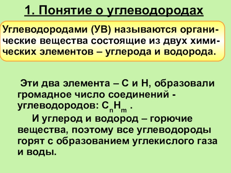 Углеводородами (УВ) называются органи-ческие вещества состоящие из двух хими-ческих элементов – углерода и водорода.