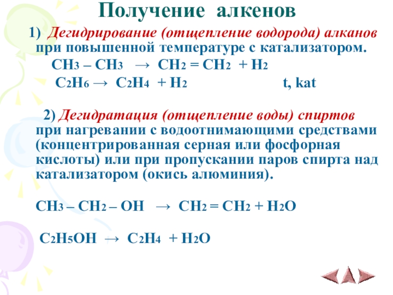 Получение (дегидрогенизация алканов, дегидратация спиртов, Получение (дегидрогенизация алканов, дегидратация спиртов, дегидрогалогенирование галогенпроизводных, Получение (дегидрогенизация алканов, дегидратация спиртов, дегидрогалогенирование галогенпроизводных, дегалогенирование)