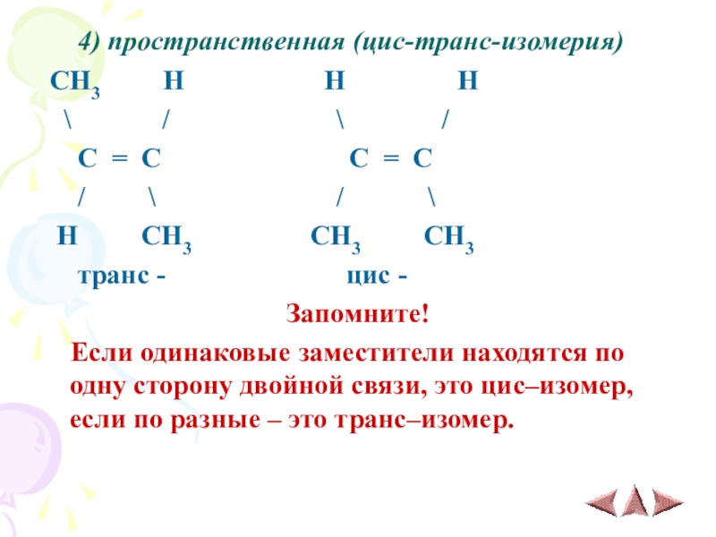Если одинаковые заместители находятся по одну сторону двойной связи, это цис–изомер, если по разные – это транс–изомер.