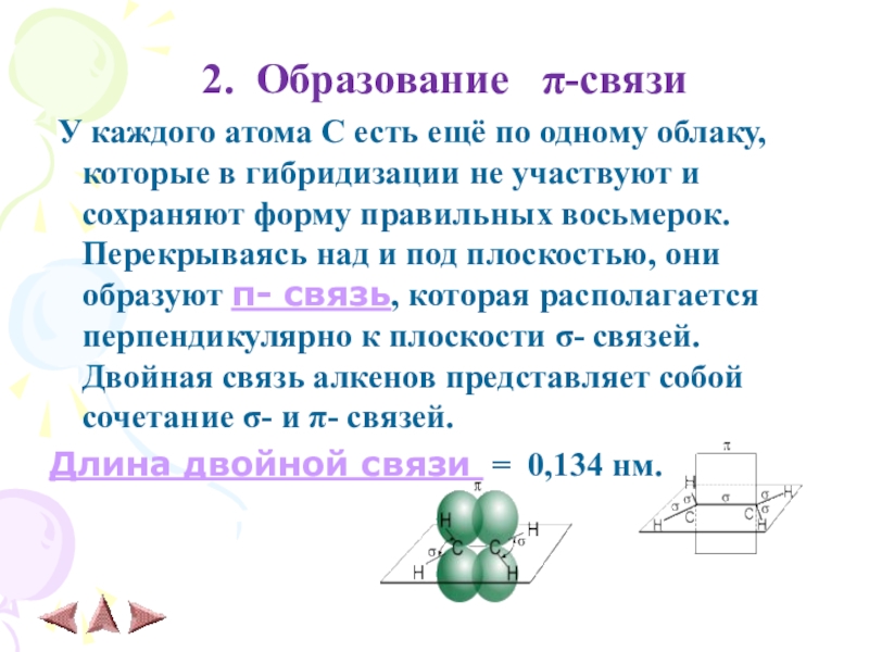 У каждого атома С есть ещё по одному облаку, которые в гибридизации не участвуют и сохраняют форму правильных восьмерок. Перекрываясь над и под плоскостью, они образуют π- связь, которая располагается перпендикулярно к плоскости σ- связей. Двойная связь алкенов представляет собой сочетание σ- и π- связей.