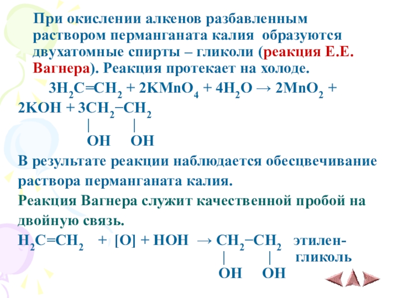 Слайд 14 При окислении алкенов разбавленным раствором перманганата калия образуются двухатомные