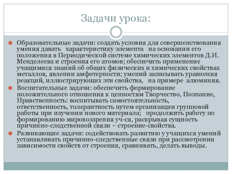 элемента на основании его положения в Периодической системе химических элементов Д.И.Менделеева и строения его атомов; обеспечить применение учащимися знаний об общих физических и химических свойствах металлов, явлении амфотерности; умений записывать уравнения реакций, иллюстрирующих эти свойства, на примере алюминия.