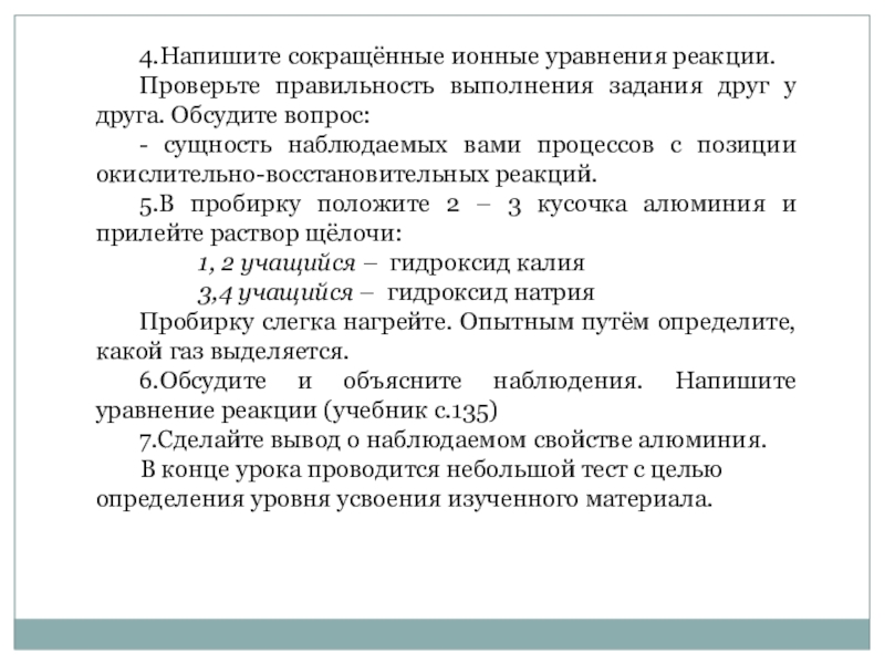6.Обсудите и объясните наблюдения. Напишите уравнение реакции (учебник с.135)