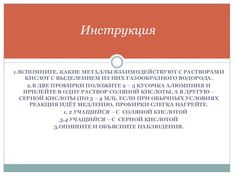 1.Вспомните, какие металлы взаимодействуют с растворами кислот с выделением из них