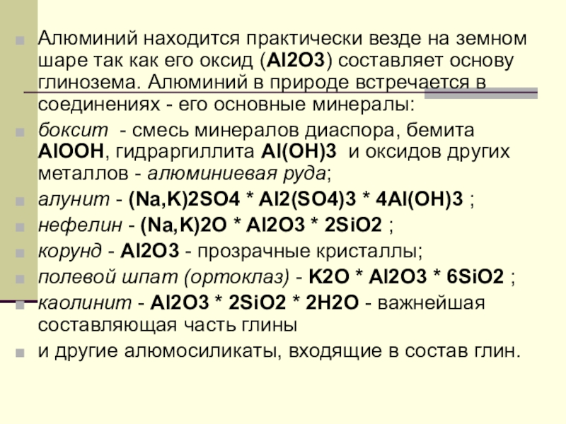 (Al2O3) составляет основу глинозема. Алюминий в природе встречается в соединениях - его основные минералы:
