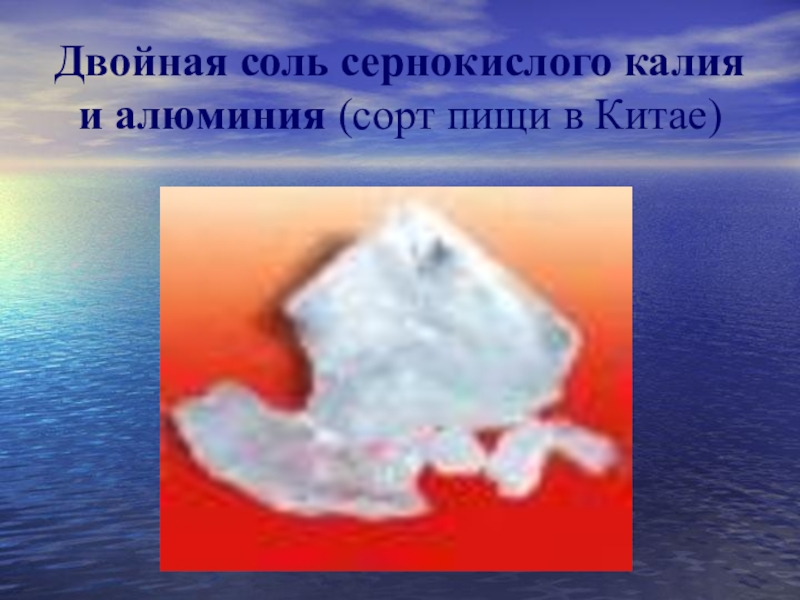 Слайд 8Двойная соль сернокислого калия и алюминия (сорт пищи в Китае)