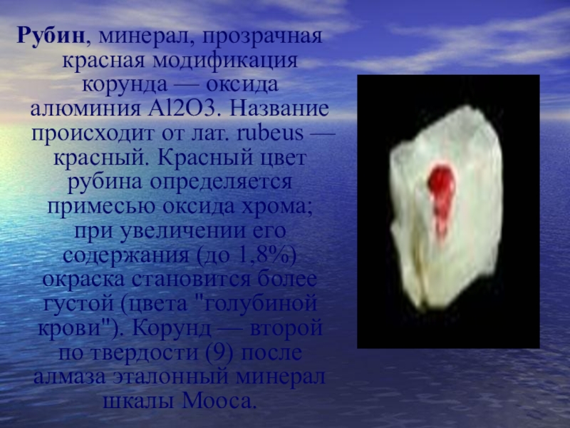 Слайд 12Рубин, минерал, прозрачная красная модификация корунда — оксида алюминия Al2O3. Название