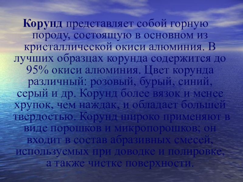 Слайд 11Корунд представляет собой горную породу, состоящую в основном из кристаллической окиси