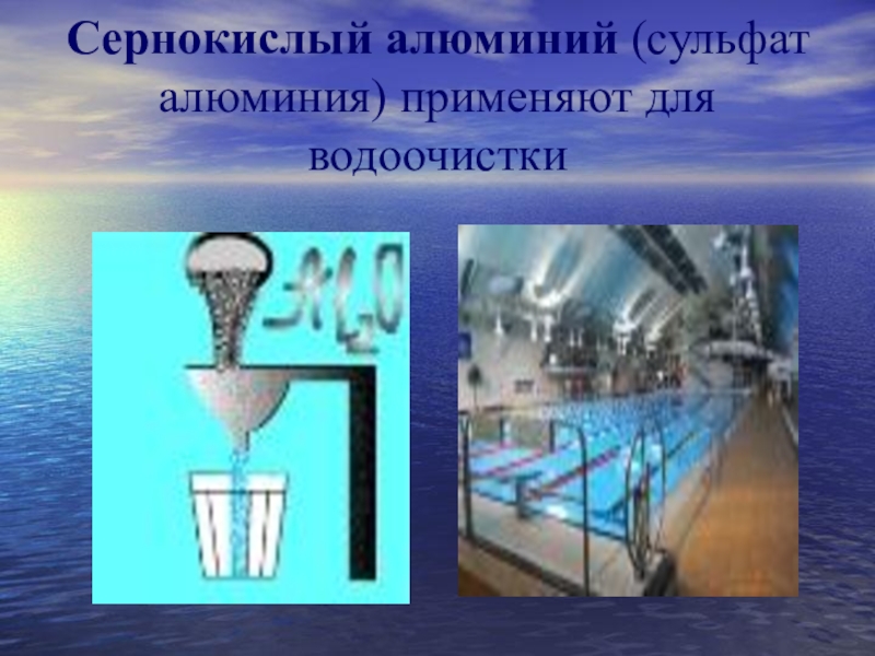 Слайд 6Сернокислый алюминий (сульфат алюминия) применяют для водоочистки