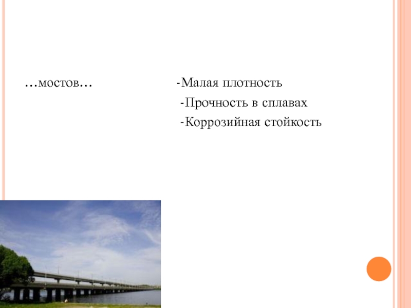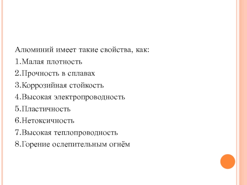 Алюминий имеет такие свойства, как:1.Малая плотность2.Прочность в сплавах3.Коррозийная стойкость4.Высокая электропроводность5.Пластичность 6.Нетоксичность7.Высокая теплопроводность8.Горение ослепительным огнём