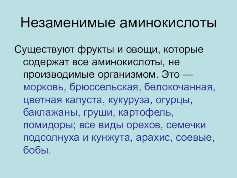 Аминокислоты — важный компонент пищи. Существует 25 разновидностей аминокислот. Все