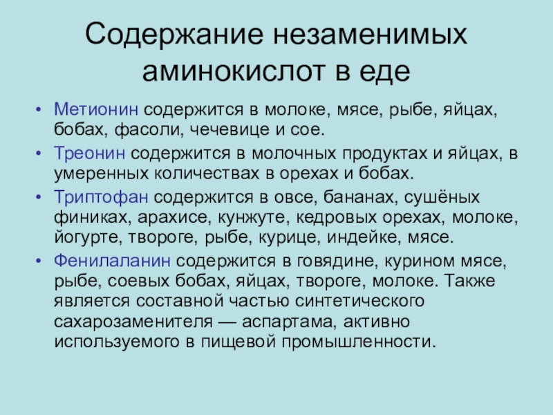 Содержание незаменимых аминокислот в едеМетионин содержится в молоке, мясе, рыбе, яйцах, бобах, фасоли, чечевице и сое. Треонин